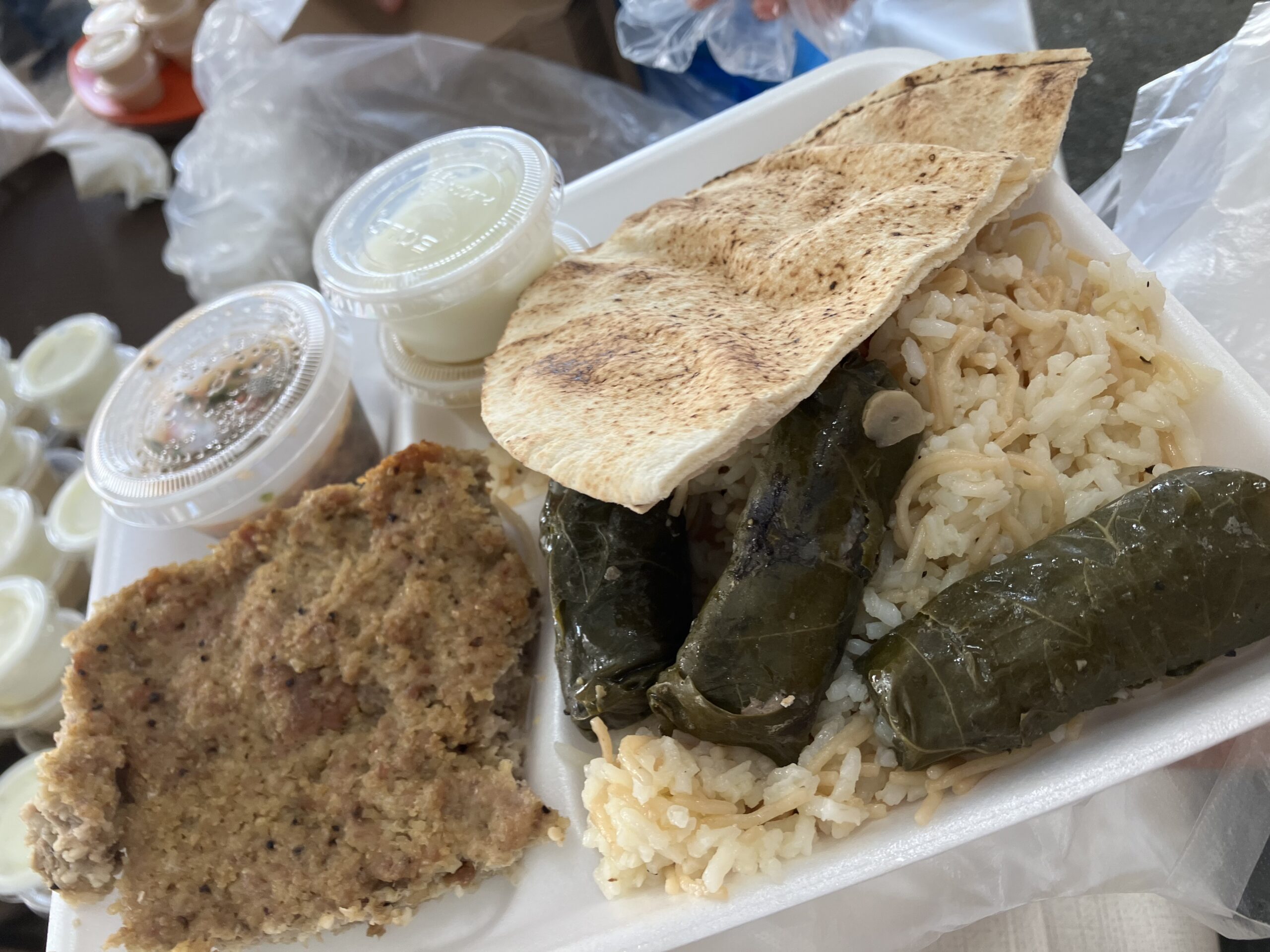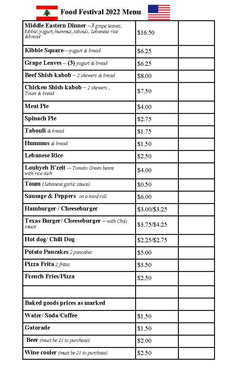 Delicious homemade Lebanese Foods: Kibbee, Stuffed Grape Leaves, Spinach & Meat Pies, Shish Kebobs, tabouli, garlic tuom, bread, etc… Pastries include baklawa, shredded wheat with cheese/nuts, farina, plus cakes, cupcakes & cookies. Local picnic favorites are sausage & peppers, potato pancakes, pizza frita, burgers & hotdogs with or without chili sauce, canned beer, etc. (no clams this year)(Pastries run around $3.00 piece to approx $14 for sampler 4 pack) Priced menu for above will be posted prior to Friday.