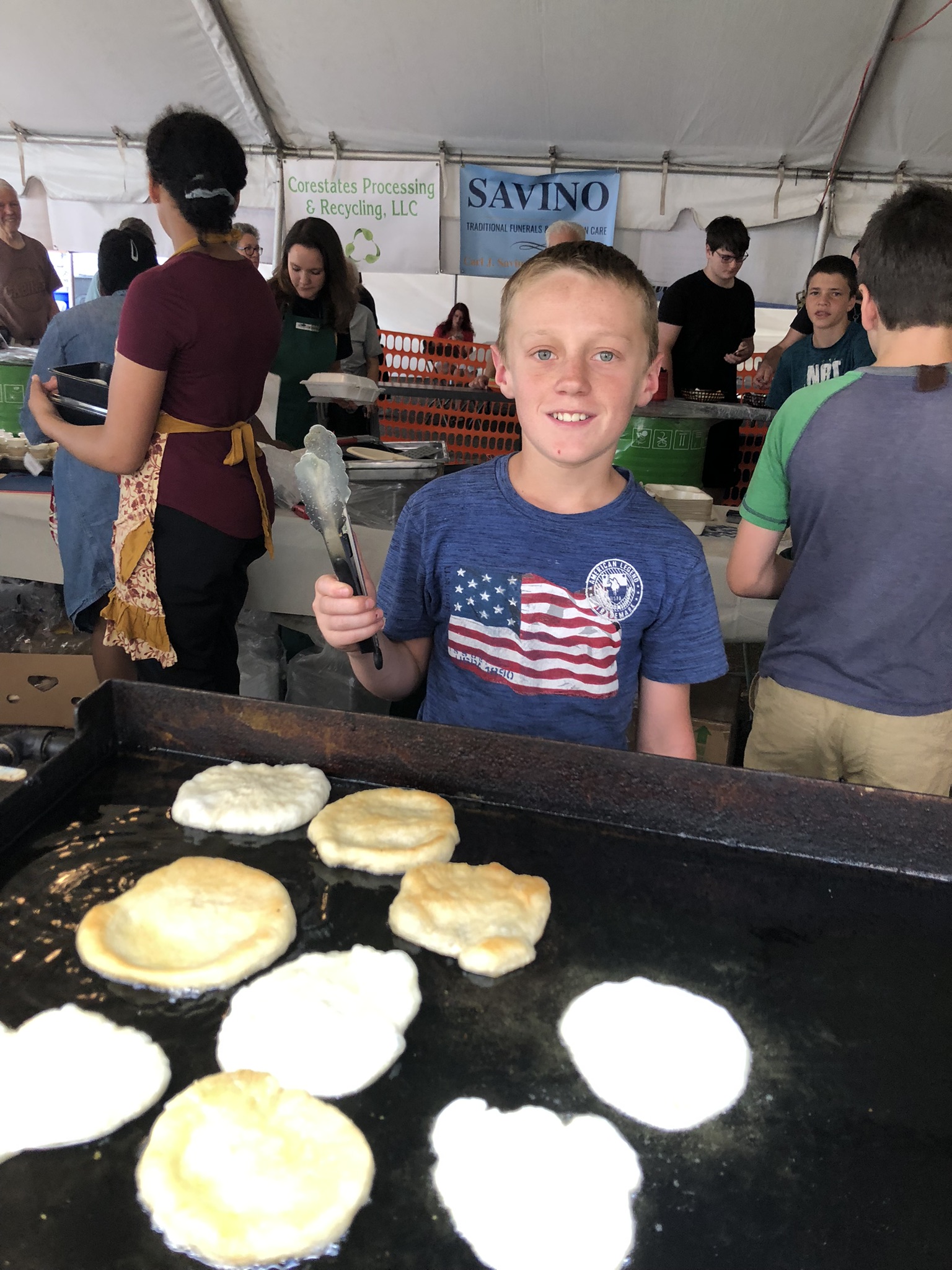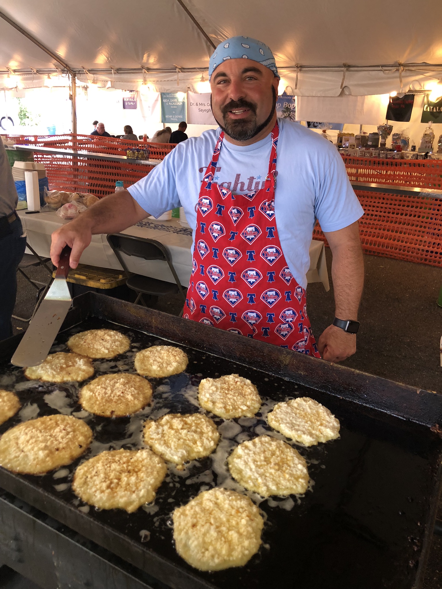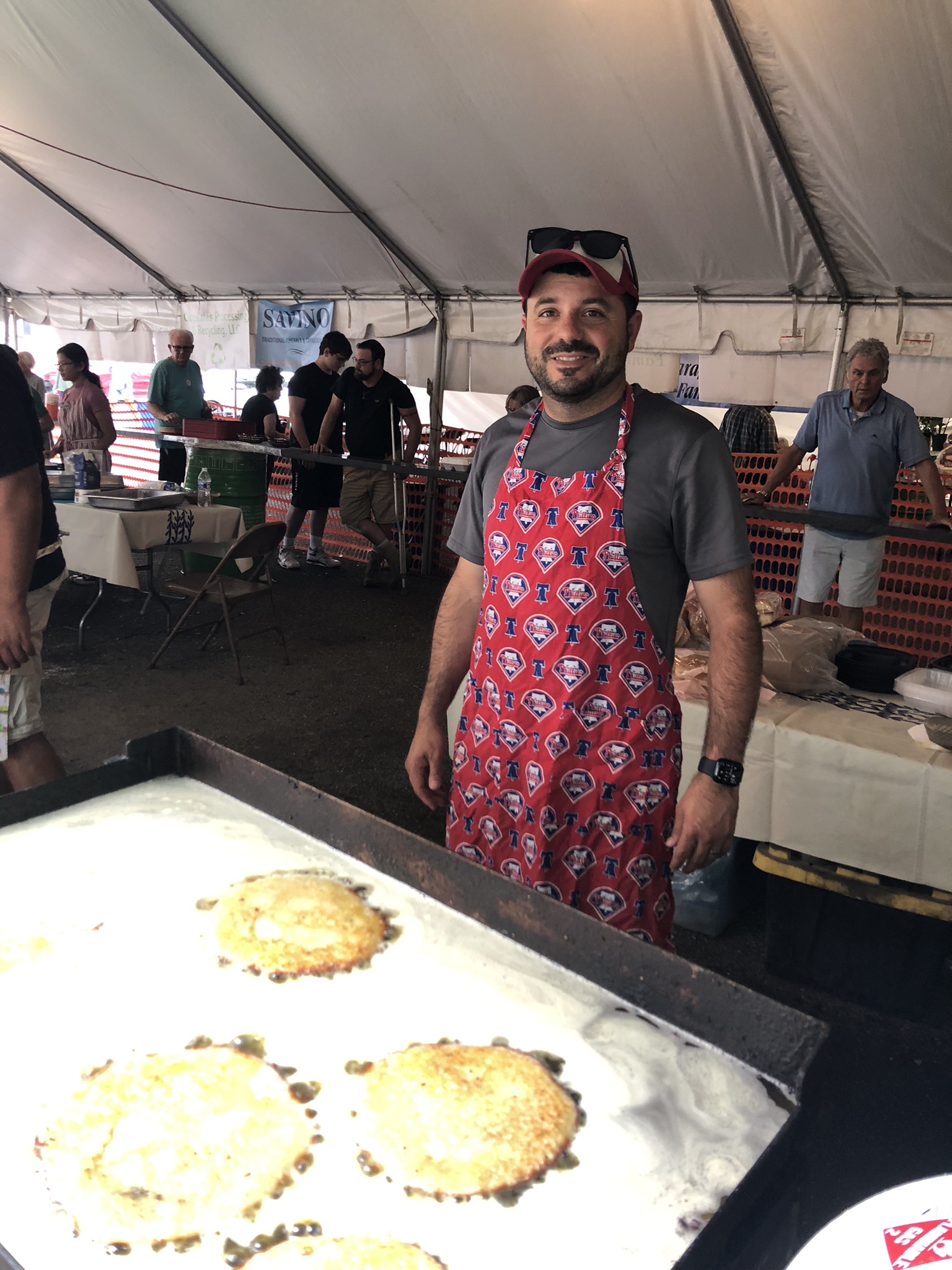 American picnic fare: potato pancakes, sausage & peppers, burgers, dogs, fries, pizza fritta, bottled soda, water & canned beer (21 & up), no clams or beer tent.